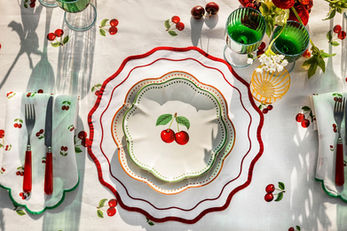 Tutti Frutti brings Capri to your cupboard, with the Italian island’s famous ceramics and linens decorating a tablescape with Mediterranean color all year long. Ripe cherries, bright lemons, and lush peaches adorn the plates, napkins, and utensils. With each piece, this collection bursts with the flavors, colors, and bounty of Capri.